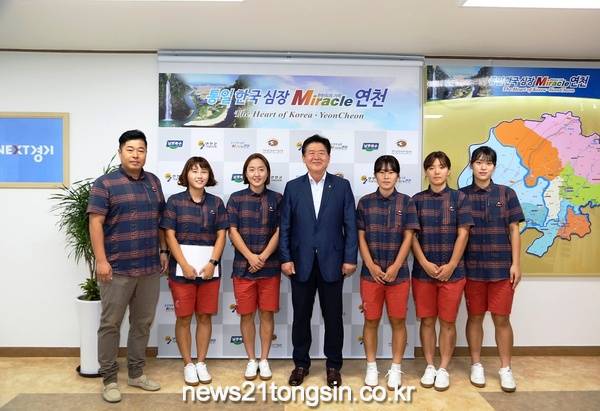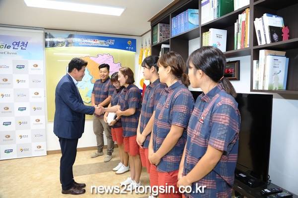 김광철 연천군수가 제18회 자카르타-팔렘방 아시안게임에서 빛나는 성과를 거두고 돌아온 연천군청 사이클팀을 반갑게 맞았다.