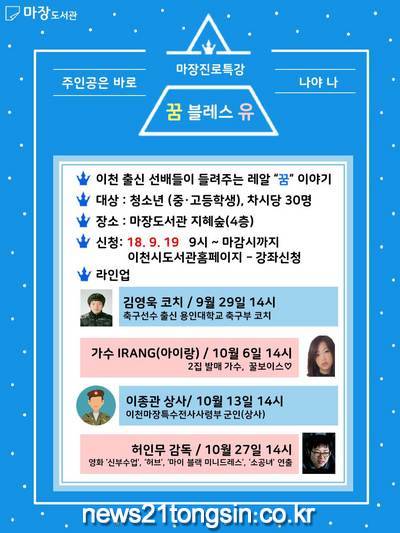 이천마장도서관은 오는 29일부터 10월 27일까지 4회에 걸쳐 청소년들을 위한 진로특강을 개최한다.