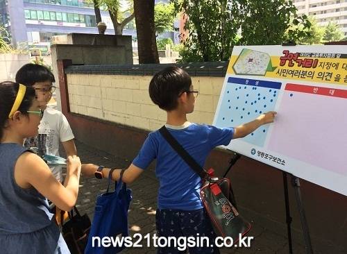지난 6월~8월에는 설문조사를 통해 지역주민의 의견을 수렴했다. 금연거리 예정 구역에서 판넬을 설치하여 의견을 받거나 동 주민센터를 방문하는 주민을 대상으로 서면조사를 실시한 결과 95.5%가 학교 주변 통학로 금연거리 지정에 대해 찬성하는 것으로 나타났다.