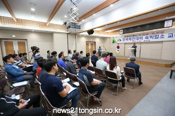 (전북/뉴스21)송태규기자= 완주군이 숙박업소 친절‧안전교육을 실시, 전국체전 대비에 만전을 기하고 있다. 28일 완주군은 군청 1층 문화강좌실에서 전국체전대비 숙박업 영업자 대상 친절 및 안전교육을 실시했다. 이날 교육은 관내 66개 숙박업소 영업자를 대상으로 위생 및 친절교육 관련 분야 전문가인 김연선 강사를 초빙해 영업자들에게 필요한 친절서비스 실천 매뉴얼과 지켜야 할 청결사항에 대해 설명했다.