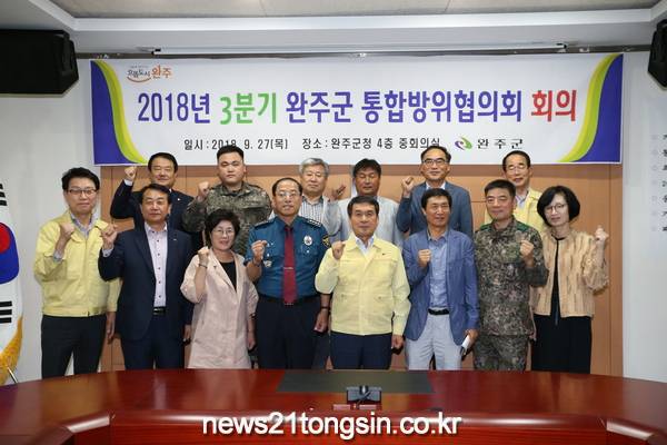 (전북/뉴스21)송태규= 완주군통합방위협의회(의장 박성일 군수)가 통합방위협의회를 열고, 지역안보태세를 강화했다. 28일 완주군은 지난 27일 군청 4층 중회의실에서 통합방위 위원 20여명이 참석한 가운데 2018년 3분기 통합방위협의회를 개최했다. 이날 회의에 앞서 제8대 완주군의회 의장으로 선출된 최등원 의장과 위원이 된 김석기 전북동부보훈지청장, 국가정보원 전북지부 수사관을 소개하고 각별한 관심을 가지고 적극적인 활동을 할 것을 당부했다. 이번 정기회의에서는 지역통합방위 태세 확립 및 제3차 남북정상 회담 개최 등 한반도 평화와 비핵화에 일조할 수 있는 협의회가 되기 위해 각 기관별 협의사항을 토의했다.