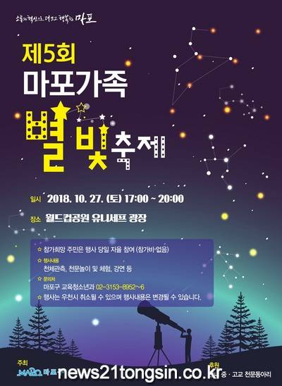 유동균 마포구청장은 “‘마포가족 별빛축제’가 청소년들이 우주와 과학에 대한 상상력과 꿈을 키워 나가게 되는 계기가 되었으면 한다.”며 “가족과 함께 특별한 추억을 남길 수 있는 이번 축제에 많은 분께서 참여해 주시기를 바란다.”라고 말했다.