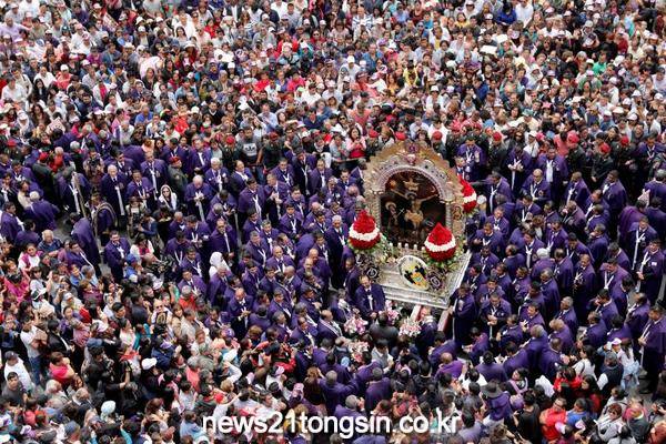 페루에서 가장 존경받는 가톨릭 아이콘인 '세뇨르 데 로스 밀라그로스(기적의 군주)' 행렬에 참여한 가톨릭 신도들.