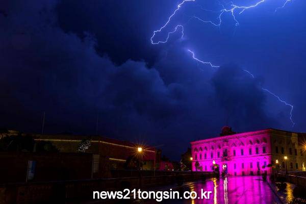 몰타 수도 발레타에 폭풍우가 다가오고 있는 가운데 조세프 무스카트 총리실 인근에서 번개가 치고 있다.