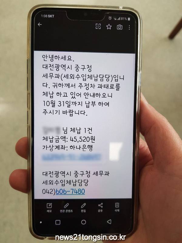 [대전=뉴스21통신] 나장용 기자 = 대전 중구(구청장 박용갑)가 주정차 위반 과태료 체납안내 문자메시지를 발송하며 세외수입 체납 독려에 박차를 가하고 있다.
