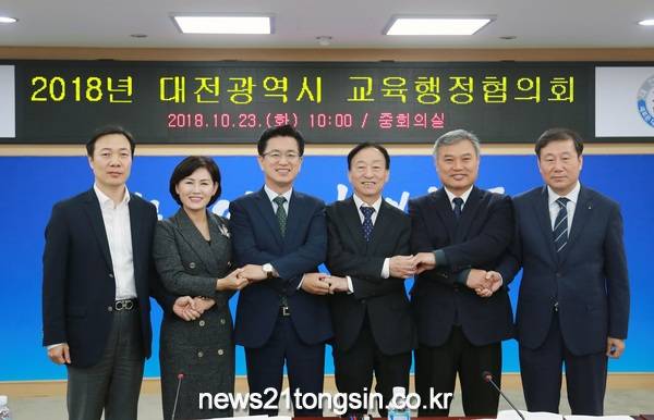 대전시는 23일 오전 10시 시청 중회의실에서 허태정 시장과 설동호 시교육감이 참석한 가운데‘2018 대전광역시 교육행정협의회’를 개최하고, 내년도 고교까지 무상급식 전면 시행과 무상 교복 지원, 기관별 분담비율 조정 등 15개 안건에 상호 합의했다.