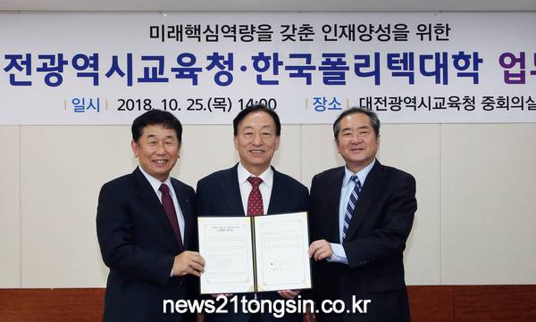 [뉴스21통신] 이영남 기자 = 대전시교육청(교육감 설동호)은 10월 25일(목) 14:00, 시교육청 6층 중회의실에서 한국폴리텍대학과 미래핵심역량을 갖춘 인재 양성을 위한 업무협약(MOU)를 체결했다.