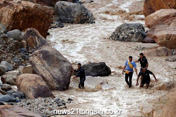 요르단 서쪽 사해 인근에서 25일(현지시간) 발생한 홍수로 버스에 타고 있던 승객 20명이 사망했다. 사진은 구조대원들이 생존자를 수색하고 있는 모습.