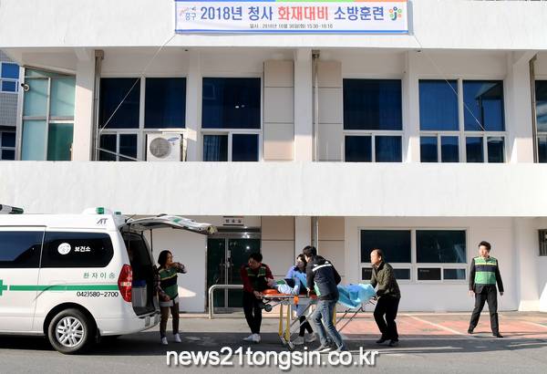 [대전=뉴스21통신] 나장용 기자 = 대전 중구(구청장 박용갑)는 30일 청사 내에서 중부소방서 부사119센터(센터장 이태희)와 함께 화재대비 합동소방훈련을 실시했다.