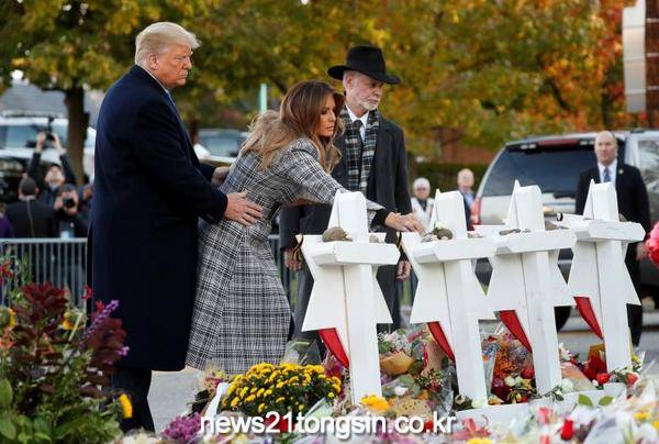 도널드 트럼프 미국 대통령과 멜라니아 여사가 30일(현지시간) 피츠버그를 방문해 총기 난사 희생자들을 추모하고 있다. 지난 27일 피츠버그 유대교 사원에서 총기 난사 사건으로 11명이 사망하고 6명이 다쳤다.