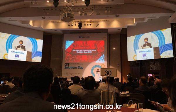 ▲ 굿모닝아이텍 김도은 이사가 GIT솔루션즈데이에서 레드햇 오픈쉬프트 관련 주제발표 중이다가상화, 클라우드 및 빅데이터 전문기업 굿모닝아이텍이 레드햇과 협력해 오픈소스 하이브리드 클라우드 플랫폼 구축 사업에도 본격 출사표를 던졌다.