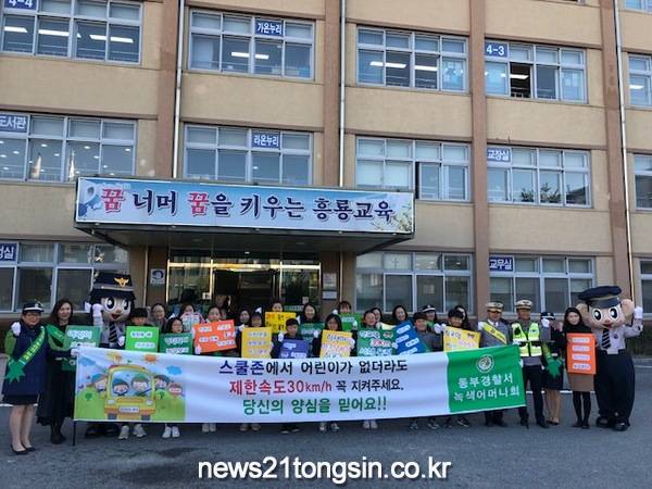 동부서는 등교 시간에 학생들의 통행이 많은 흥룡초등학교 주변에서 녹색어머니회와 합동으로 스쿨존 내 30km 준수하기를 홍보하며 교통안전 활동을 펼쳤다.