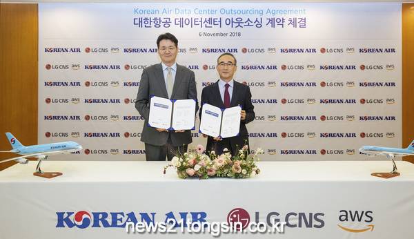 ▲ (왼쪽부터) 조원태 대한항공 사장과 김영섭 LG CNS 사장이 업무 체결식 서명을 마치고 기념촬영을 하고 있다.대한항공이 고객 서비스 수준을 한 단계 더 높이기 위해 정보기술(IT) 체질 강화에 나선다. 이를 위해 대한항공은 국내 대기업 및 전 세계 대형 항공사로는 최초로 전사 시스템을 클라우드로 전환한다고 6일 밝혔다. 시스템 구축 및 운영은 LG CNS가 맡고 클라우드는 아마존웹서비스(AWS)를 활용한다.