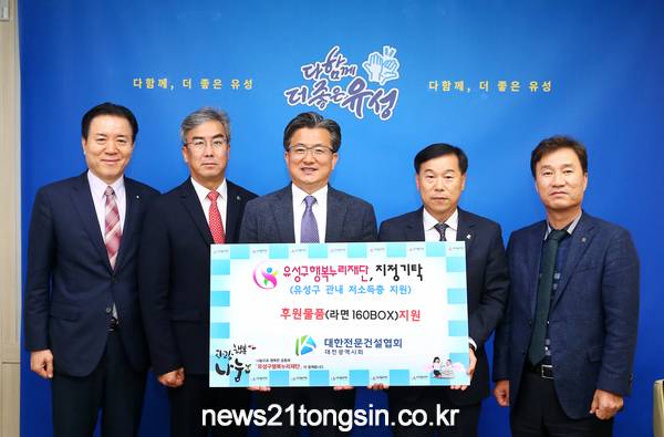 [대전=뉴스21통신] 나장용 기자 = 대전 유성구(구청장 정용래)는 7일 구청 행복사랑방에서 대한전문건설협회 대전광역시회(회장 김양수)가 유성구행복누리재단에 300만원 상당의 라면 160박스를 기탁했다고 밝혔다.