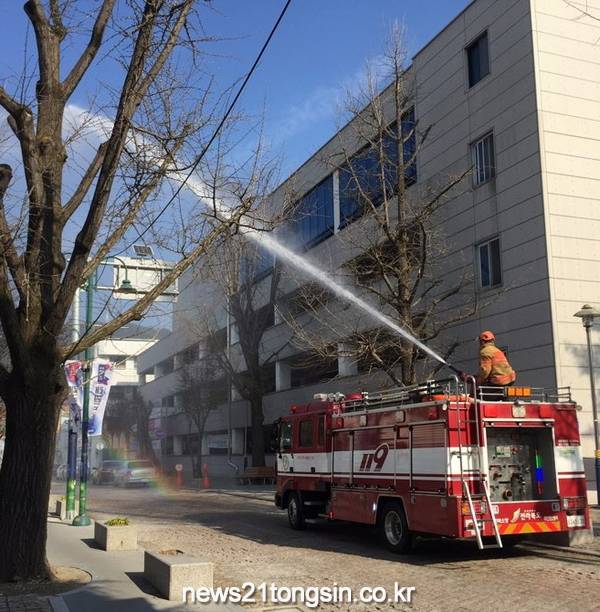 (전북/뉴스21)송태규기자= 무주군은 지난 27일 군청 분수대 옆에서 2018 합동 소방훈련은 실시했다. 이날 훈련은 소방관서와 군청과의 합동 훈련을 통해 화재를 초기에 진압하고 인명 및 재산피해를 최소화한다는 취지에서 개최된 것으로, 무주군 자위소방대 윤여일 부대장(무주군 부군수)을 비롯한 지휘, 진압, 구조 · 구급분대, 유도 · 경계분대 대원들과 무주 119 안전센터 관계자 등 1백여 명이 참가해 화재통보와 피난유도, 소화 훈련을 실시했다.