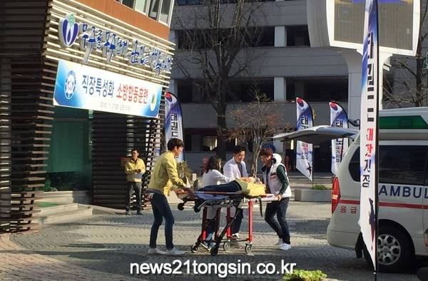 이외에도 자위소방대 자체 소방시설(소화기 및 등짐펌프, 옥내 소화전 등)을 활용한 화재진압과 인명구조, 부상자 후송, 화재현장 출입금지 및 구급차와 소방차 진입로 확보 훈련이 진행됐다.