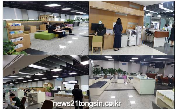 내방 민원인이 카페처럼 편안하게 앉아 음료를 마실 수 있도록 소파와 테이블을 설치했고 분산되어 있던 정보검색용 PC와 복사기, 팩스기 등의 편의시설을 한 공간에 모았다.