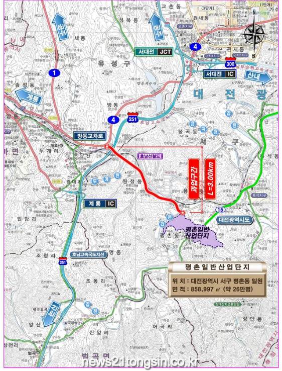 평촌산단 진입도로 개설공사는 총사업비 390억 원을 들여 서구 평촌동(평촌일반산업단지) ~ 유성구 방동 (국도4호선)까지 3.0㎞구간에 대해 왕복 2차로(폭 10m) 도로를 개설하는 사업으로, 지난 11월 29일 사업노선 확정 및 총사업비 조정을 승인 받았다.