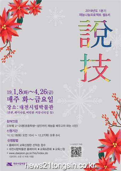 대전시립박물관은 오는 18일부터 27일까지 2019년도 제1분기 재능나눔 프로그램 ‘썰(說)&끼(技)’에 참여할 수강생을 모집한다.