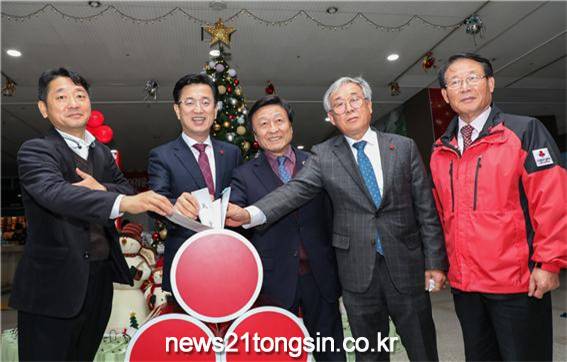 대전시는 13일 오후 5시 시청1층 로비에서‘크리스마스트리’와‘미니 사랑의 온도탑’합동점등식을 개최했다.