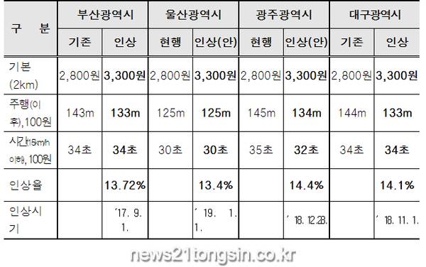인상된 택시요금은 기본(2㎞) 2,800원에서 3,300원으로, 거리요금은 140m당 100원에서 133m당 100원으로 인상됐으며, 15㎞/h 이하 운행 시 병산되는 시간요금은 34초 당 100원으로 현행과 같다.