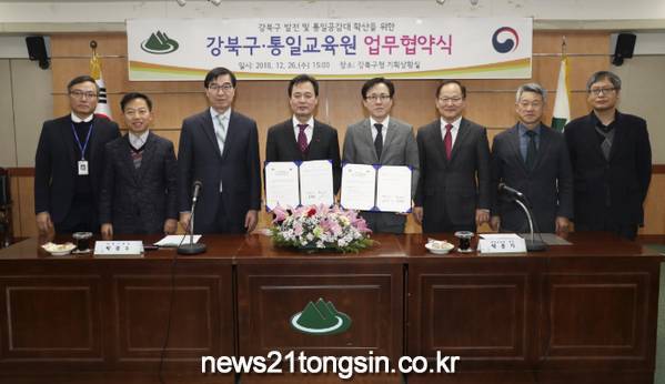 ▲ (사진=강북구청)강북구(구청장 박겸수)가 기해년 새해를 맞아 통일 공감대 확산을 위한 다양한 분야의 교류·협력 사업을 추진한다. 구는 최근 통일교육원(원장 백준기)과 긴밀한 협력체제 구축을 내용으로 하는 업무협약을 체결했다.