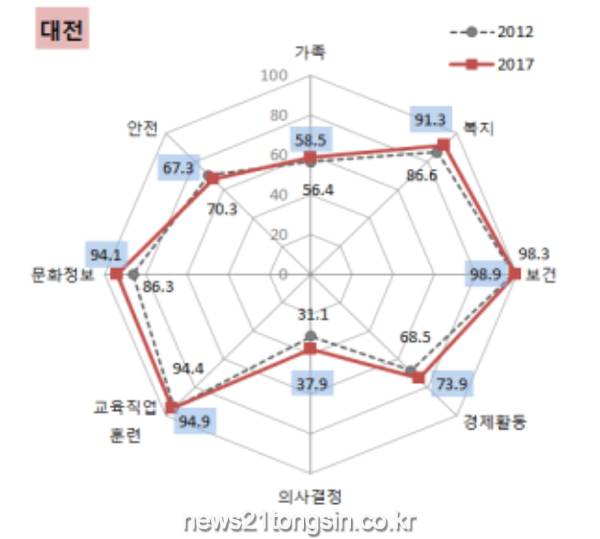 대전지역 분야별 성평등지수는 보건분야 98.9점, 문화 ․ 정보 분야는 94.1점으로 전국 1순위를 기록했다.