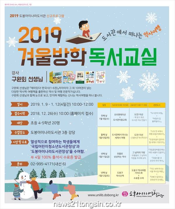 ▲ 도봉아이나라도서관, 겨울방학독서교실(도봉구 제공) 도봉구(구청장 이동진)는 오는 1월 9일부터 12일까지 4일간 도봉아이나라도서관에서 초등학생 4-5학년을 대상으로 겨울독서교실 ‘도서관으로 떠나는 역사여행’을 진행한다.