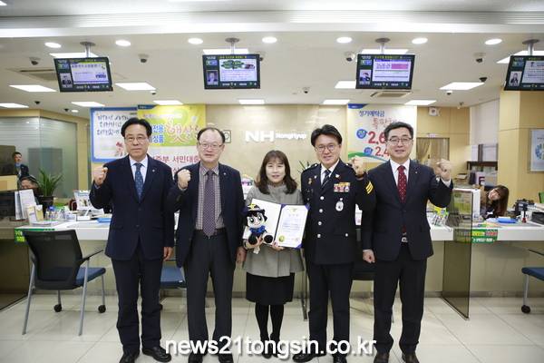 【대전=뉴스21통신】이영남 기자 = 황운하 대전경찰청장은 1월 9일 오전 회덕농협 중리본점을 방문하여 전화금융사기(보이스피싱) 피해를 막아 시민의 소중한 재산을 보호한 직원 박모(45세, 여)씨에게 감사장과 기념품을 전달했다.