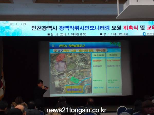 인천시(시장 박남춘)는 작년 악취로 인해 민원이 발생하였으나 공무원으로만 색출원 조사에 한계가 있어 시민들의 도움이 필요하여 1월 10일 인천시청(대회의실)에서 8개구 104명의 시민들을 광역악취시민모니터링 요원으로 위촉하여 올해부터 활동한다고 밝혔다.