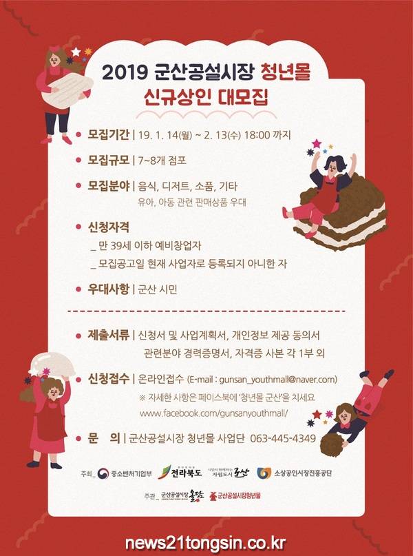 (전북/뉴스21)송태규기자군산시는 공설시장청년몰에서 창업을 통해 꿈을 실현하고 전통시장 활성화를 이끌 7~8개 점포의 신규 청년상인을 오는 2월 13일까지 모집한다고 밝혔다.