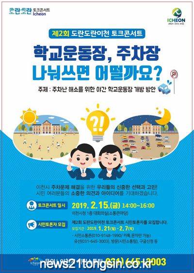 이천시(시장 엄태준)는 지난해 10월 개최한 제1회 도란도란이천 토크콘서트에 이어 다음달 15일 오후 2시 시청대회의실에서 주차난 해소를 위한 야간 학교운동장 개방 방안을 주제로 하여 제2회 토크콘서트를 개최한다.