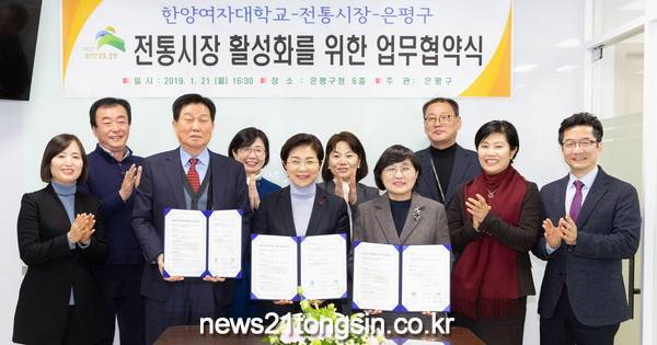은평구(구청장 김미경)는 21일 구청장실에서 은평구 전통시장 상인연합회(상인회장 전용균) 및 한양여자대학교(총장 이보숙) 관계자들이 참석한 가운데 전통시장 활성화를 위한 업무협약을 체결하였다.