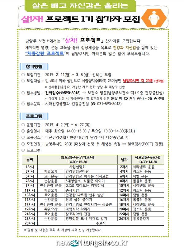 남양주보건소(윤경택보건소장)는 사회적 문제가 되고 있는 비만문제를 해결하고자 주민들의 평생건강을 위한 프로그램 ‘살자 프로젝트’를 시작한다.