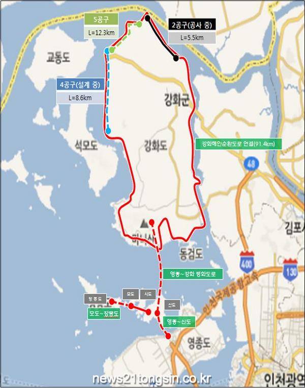 인천광역시(시장 박남춘)는 지난 7일『접경지역 발전 종합계획(이하 “계획”)』에 가장 큰 수확으로 기존 도로사업을 그대로 유지하면서 ‘영종~신도’ 평화도로(L=3.5㎞, 1,000억 원)와 함께 ‘강화해안순환도로(4,5공구)’연결사업이 신규 반영되었다고 밝혔다.