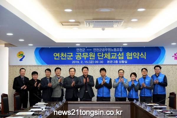연천군은 15일 군청 상황실에서 김광철 연천군수와 이성철 연천군공무원노동조합 위원장 등 노사위원 10여 명이 참여한 가운데 근무환경 개선 등을 담은 129조문 286항목의 단체협약 조인식을 가졌다.