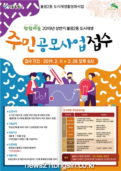 공모사업 지원서 접수는 2월 28일(목)까지 가능하며, 불광도시재생지원센터에 직접 방문하여 신청 서류를 제출하면 된다. 기타 자세한 사항은 주거재생과(☎351-8543)나 불광도시재생지원센터(☎6406-8253)에 문의하면 된다.