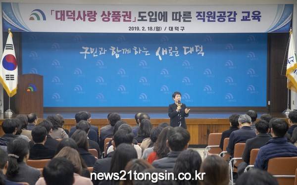 [대전=뉴스21통신] 대전 대덕구(구청장 박정현)는 18일 구청 청렴관에서 대덕사랑상품권 발행을 앞두고 지역화폐 제도 취지와 운영 방법 등에 대한 직원 공감교육을 실시했다.