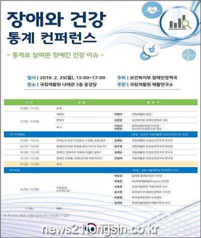 보건복지부(장관 박능후)와 국립재활원(원장 이범석)은 25일(월) 오후 1시 국립재활원 나래관(3층 중강당)에서 ‘통계로 살펴본 장애인 건강 이슈(쟁점)’를 주제로 컨퍼런스를 개최한다고 밝혔다.