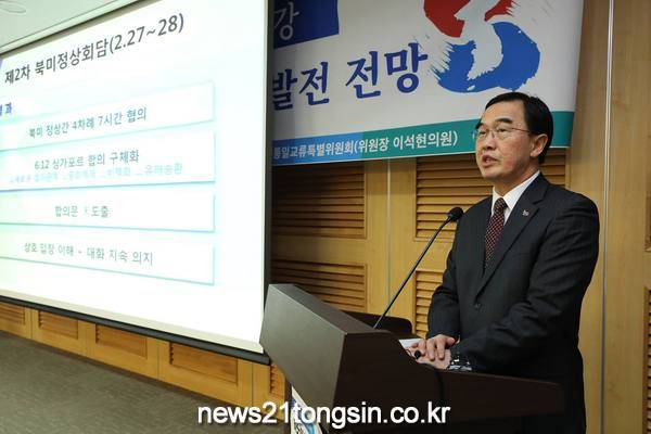 조명균 통일부 장관이 3월 5일 국회 의원회관에서 더불어민주당 한반도경제통일교류특별위원회 주최로 열린 '하노이 북미회담과 남북관계 발전 전망' 세미나에 참석하여 특강을 했다.