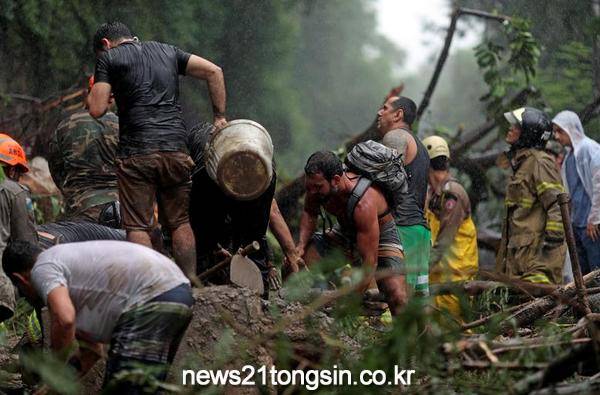 브라질 리우데자네이로에서 폭우로 인한 진흙 사태가 일어나 사람을 구조하고 있다.