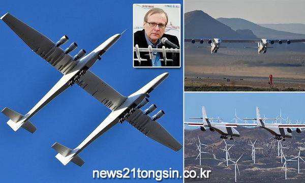 날개의 폭이 385피트(약 118m)에 이르는 세계에서 가장 큰 항공기가 13일(현지시간) 미국 캘리포니아주 모하비사막에서 첫번째 시험비행에 성공했다.