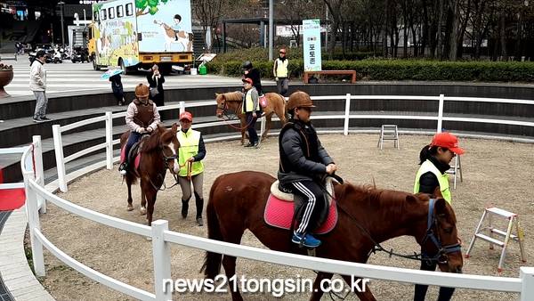 ▲ 사진제공=성동구성동구(구청장 정원오)는 한국마사회와 협력으로 관내 왕십리광장에서 지난 6일부터 4월 한 달간 매주 토요일, 일요일에 ‘도심승마체험행사’를 실시한다.(단, 4월 20일(토) 제외)