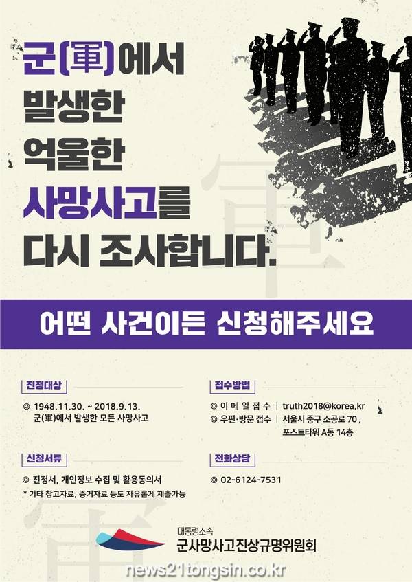 대통령소속 군사망사고진상규명위원회(이하 ’위원회’)는 지난해 9월 특별법에 따라 설립되었으며, 군대에서 발생한 억울한 사망사고를 대상으로 유가족들과 목격자 등의 진정을 받아 공정하고 객관적인 조사로 진실을 규명하는 업무를 수행하며, 이를 통해 유가족들이 명예를 회복하고, 합당한 예우를 받을 수 있도록 노력하고 있다.