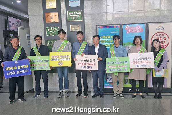 이번 캠페인은 오는 5월 1일부터 구청사 내에서 1회용 컵 사용 및 반입을 전면 금지함에 따라 직원들과 내방객들에게 이러한 내용을 사전에 알리고, 1회용품 사용 자제를 독려하기 위해 진행됐다.