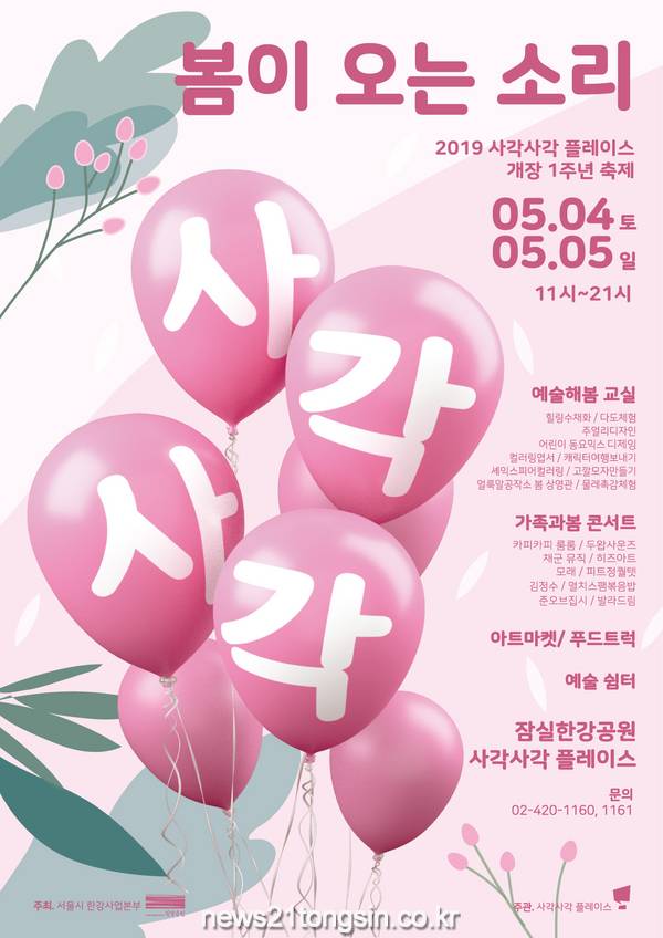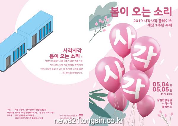 (뉴스21통신/서울서부취재본부)= 서울시(한강사업본부)는 “‘가정의 달’을 맞이하여 오는 5.4.(토)~5.5.(일) 2일간 잠실한강공원「사각사각 플레이스」에서 입주 청년예술가들과 함께 즐길 수 있는 전시, 공연 등 1주년 페스티벌 <</span>사각사각 봄이 오는 소리>를 개최한다.”고 밝혔다.