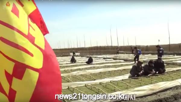 안악군 룡산협동농장에서 안악군 일군들과 농장원들이 단면한 변모판 비위관리를 깐지게 하고 있다.