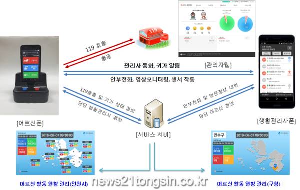 인천시는 기존의 음성통화 서비스를 쌍방향 영상통화와 조도센서를 이용한 움직임 감지를 하는 스마트 앱 기반의 안심폰으로 1,010대 시범 교체하였다.