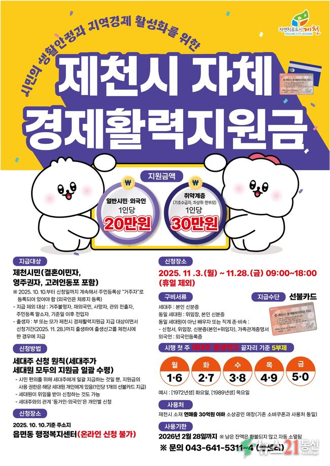제천시, 11월 3일부터 자체 경제활력지원금 지급 시작