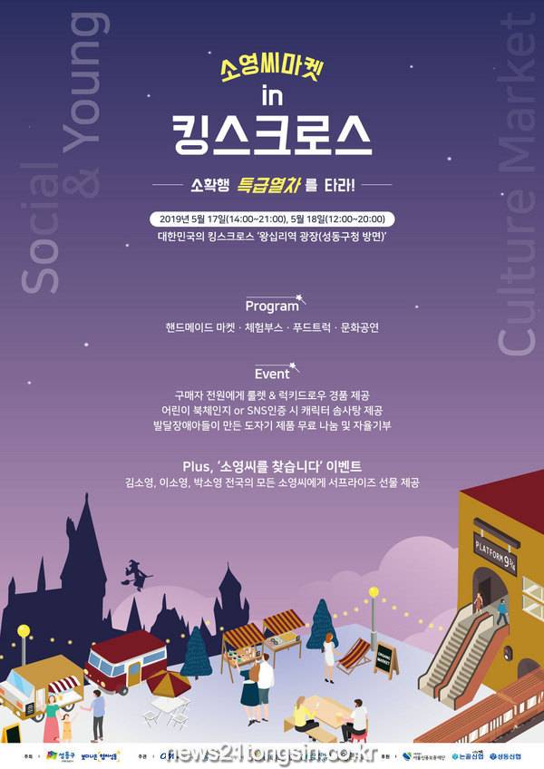 ▲ [사진=‘소영씨마켓 in 킹스크로스’문화마켓 홍보포스터]성동구(구청장 정원오)가 오는 5월 17일부터 18일까지 양일간 지역주민과 사회적기업, 소셜벤처, 청년․여성기업, 소상공인이 함께 만들어가는 협치한마당 ‘소영씨마켓 in 킹스크로스’를 개최한다고 밝혔다.